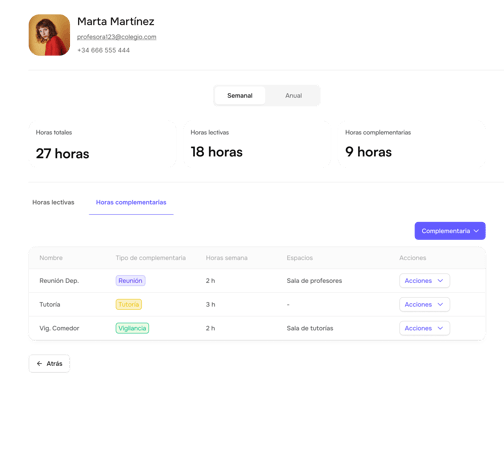 - Horas lectivas: relacionadas con las asignaturas que se imparten.
