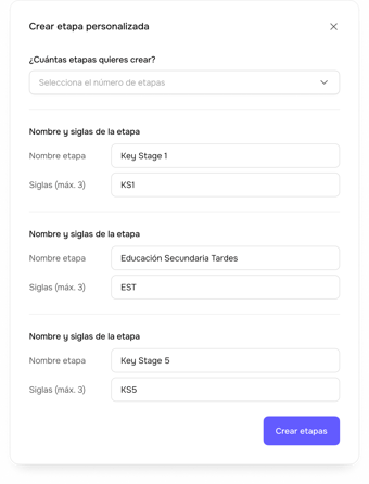 Por defecto, las etapas ofrecidas en la plataforma corresponden al sistema educativo español. Sin embargo, si el centro requiere una estructura diferente, se puede configurar de manera personalizada.