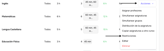 Dentro de este apartado, elige el curso y la asignatura, haz click en el botón de “Acciones” y selecciona la opción de restricciones.